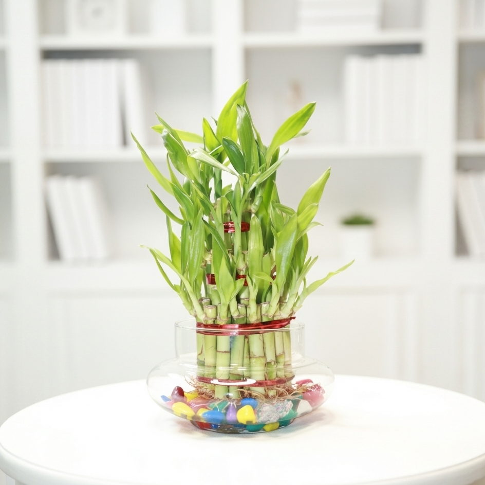 Lucky Bamboo 3 Layer Feng Shui Plant with Glass Jar | Live Indoor Plant for Home & Office | Includes Colorful Stones & Water Gel Balls | Symbol of Luck, Prosperity & Positive (Glass Bowl, 3 Layer)